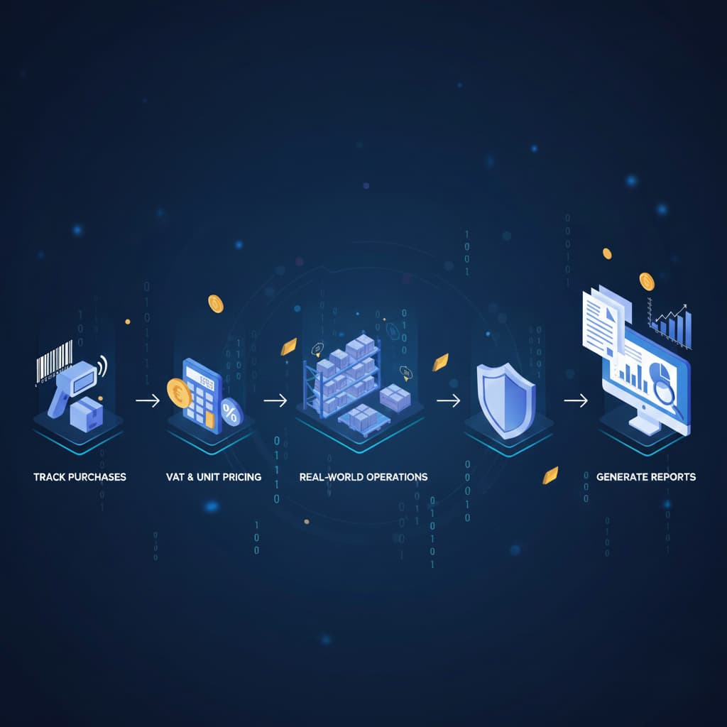 Track purchases, manage VAT and unit pricing, and generate reports that reflect real-world operations.