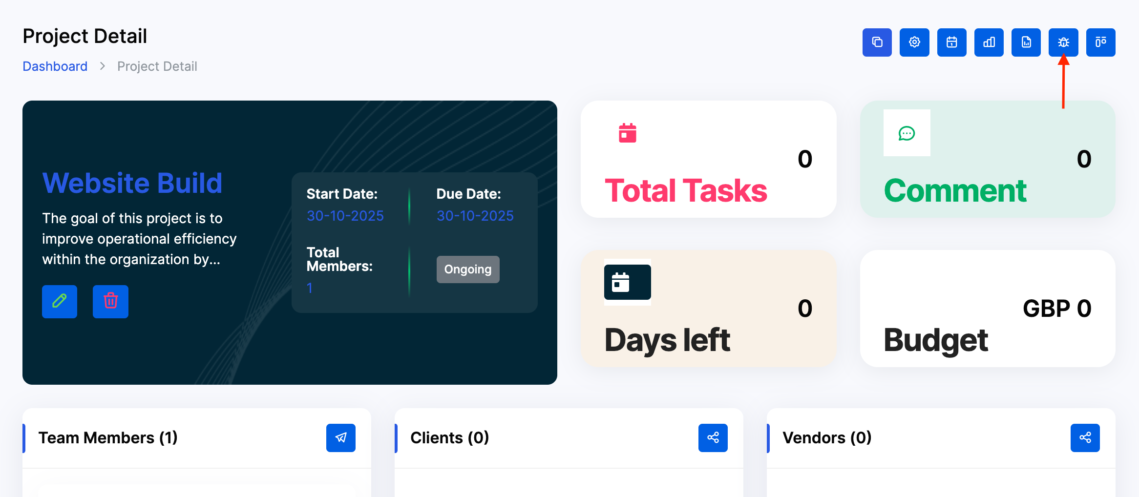 • From the Dashboard, use the side menu to navigate: Projects → Project → Select Project → Bug Report